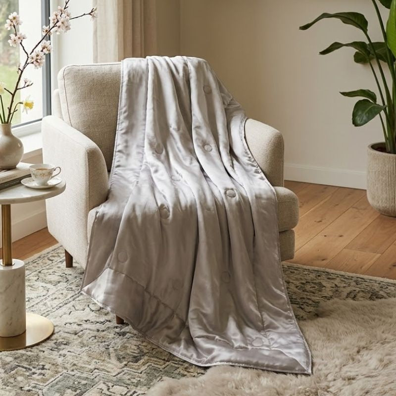 Nous ne vendons que de la soie de mûrier de qualité supérieure. C'est la soie la plus douce, la plus brillante et la plus confortable. C'est donc un gage de qualité exceptionnelle et de durabilité.