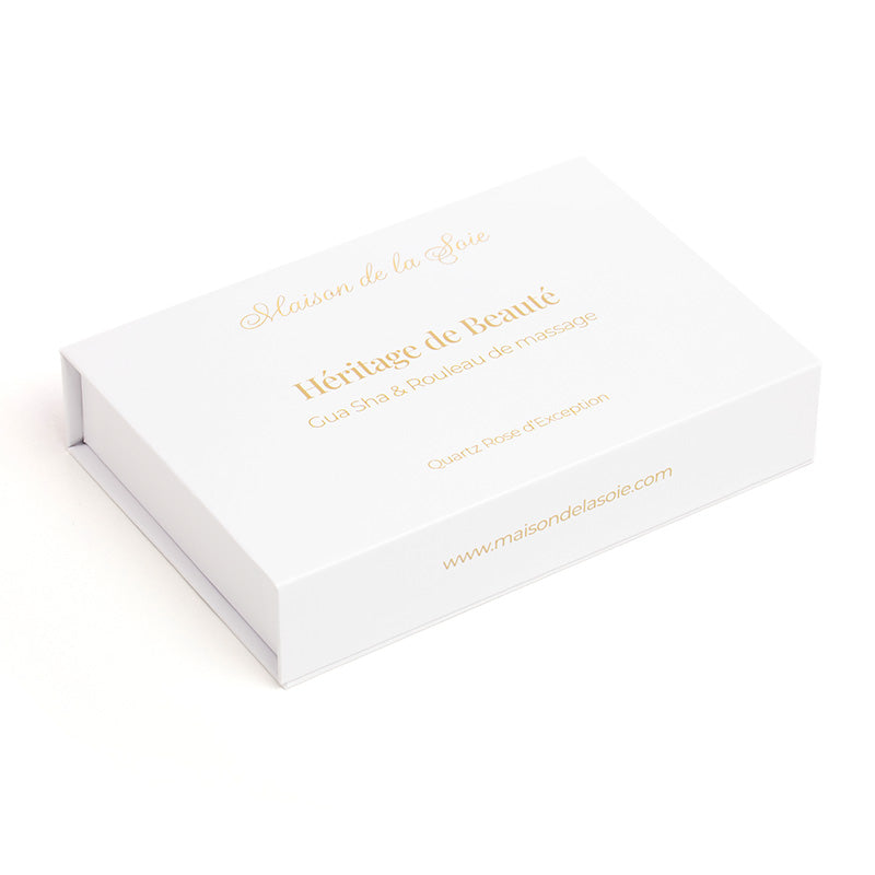 - Finishes: rounded edges for a gentle massage, solid and silent metal support + rose quartz head and handle for the roller, Maison de la Soie engraving.