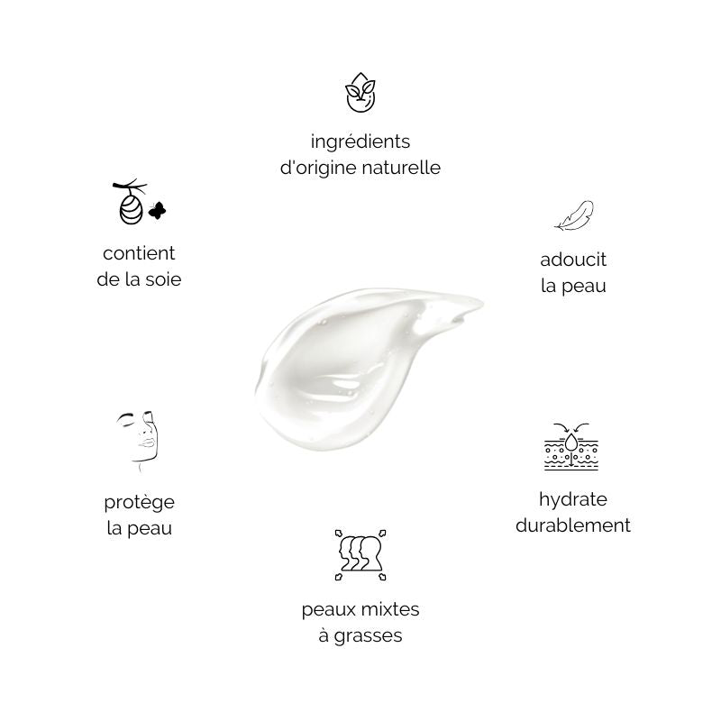 Damask rose hydrolate, the key ingredient in the formulation, provides an immediate "radiance boost" while reducing the appearance of pores. As for silk, its collagen-like structure provides a velvety feel and helps maintainskin elasticity.
