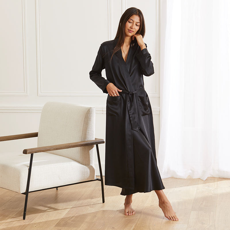 For the ultimate in relaxation, wear a long silk bathrobe. This luxurious robe is made from the finest silk, mulberry silk. And for even greater comfort, we've made it available in two sizes, S/M and L/XL.