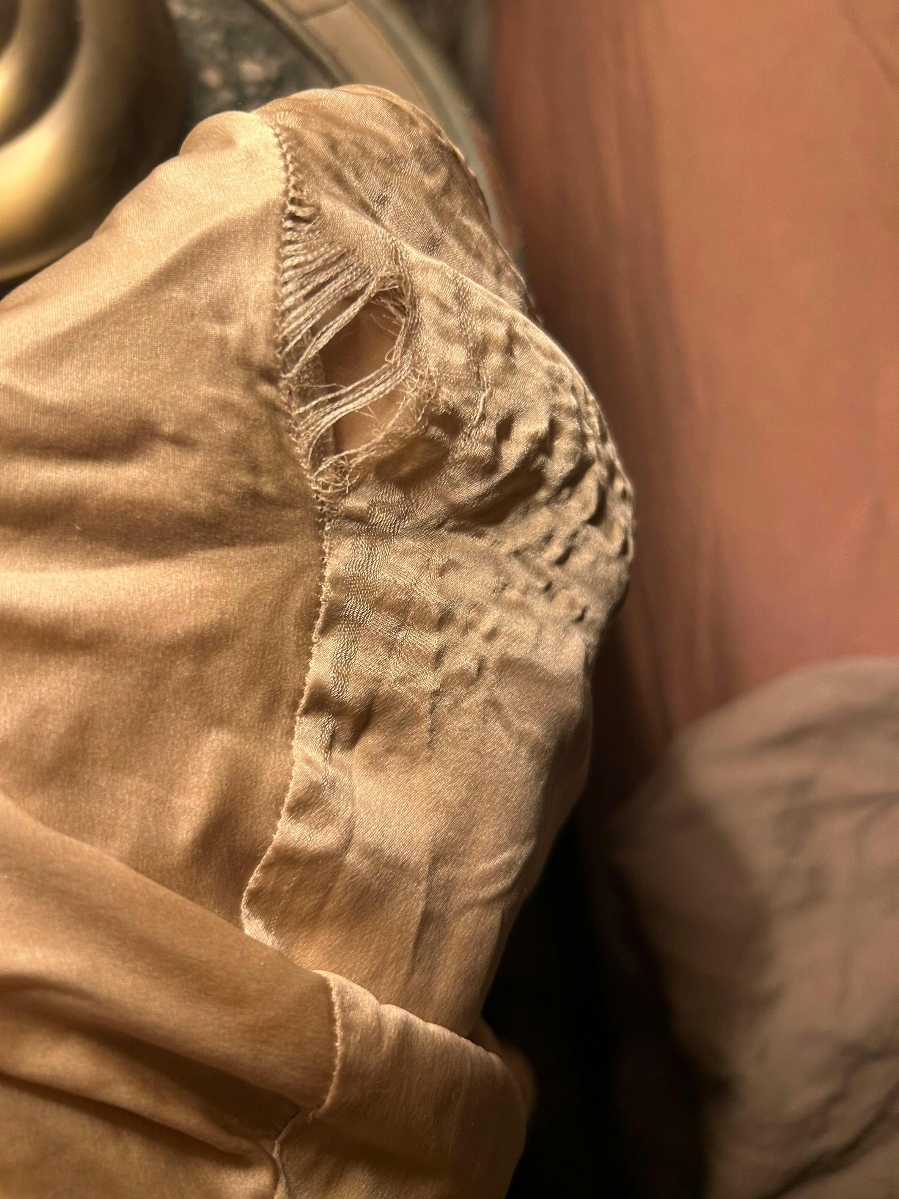 la veste du pyjama dans le dos s'est abimée dés le premier lavage. Elle n'est plus portable. Elle a été lavée avec un cycle spécial soie avec lequel je lave mes cachemires. J'ai une machine Miele qui respecte soie et cachemire. Le pantalon n'a pas été abimé. Je souhaite renvoyer le pyjama et obtenir un remboursement car il est visiblement défectueux. Cordialement