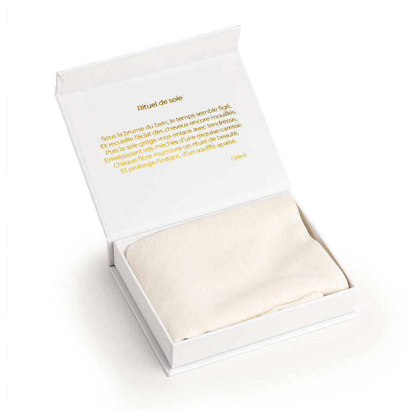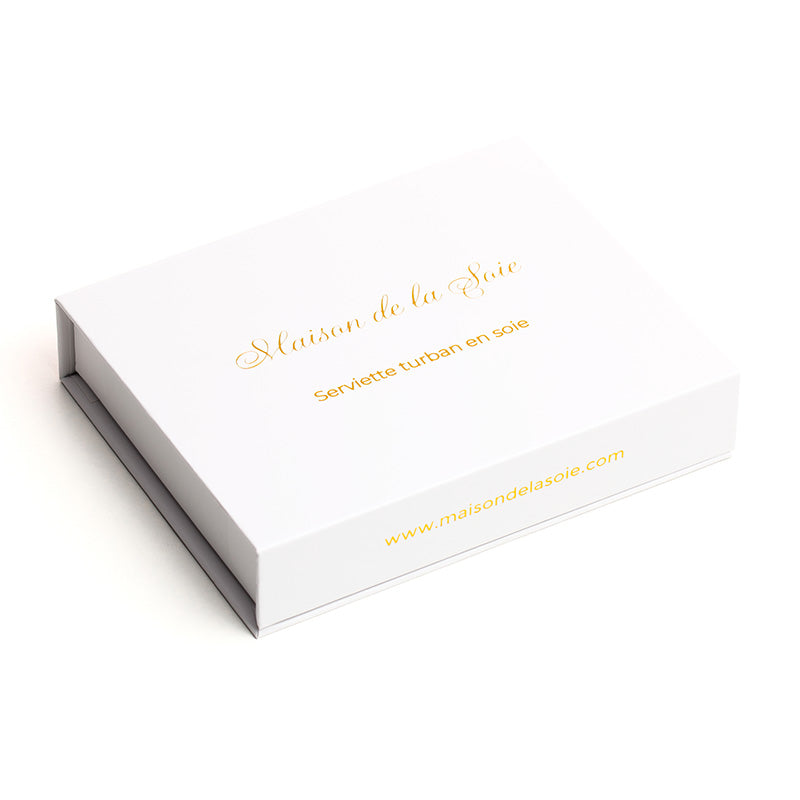 Transform your hair drying routine into a moment of pure bliss with our silk turban towel. Its natural texture gradually absorbs moisture while respecting the hair fiber, leaving your hair soft, soothed, and radiant. Presented in a luxurious gift box, it becomes part of an elegant beauty ritual where every step is a moment of well-being. An invitation to slow down, to pamper yourself, and to rediscover the simple beauty of authentic materials.
