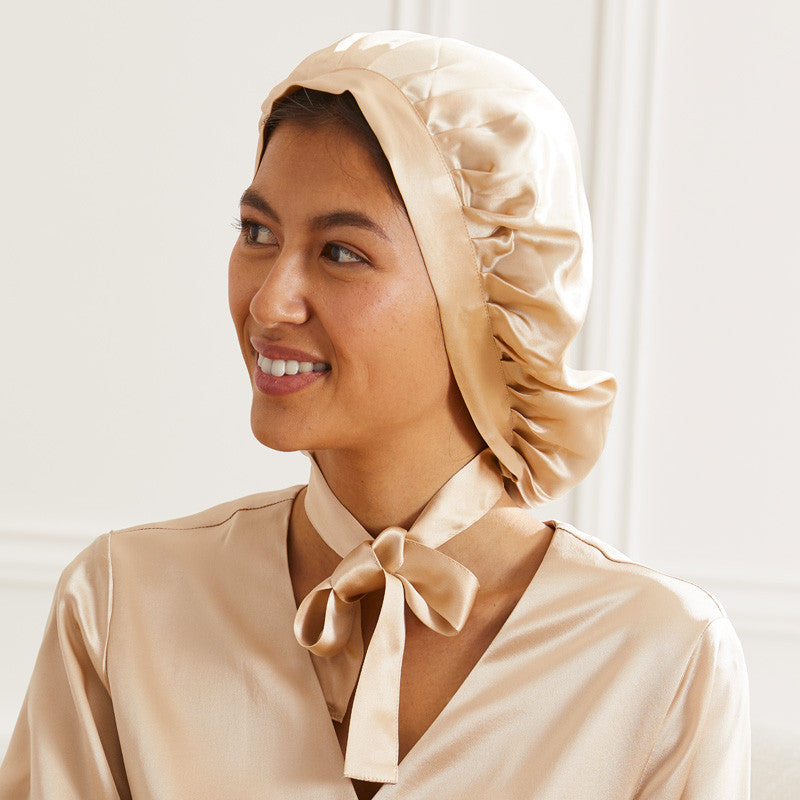 Protégez vos cheveux durant votre sommeil avec un bonnet de nuit en soie.