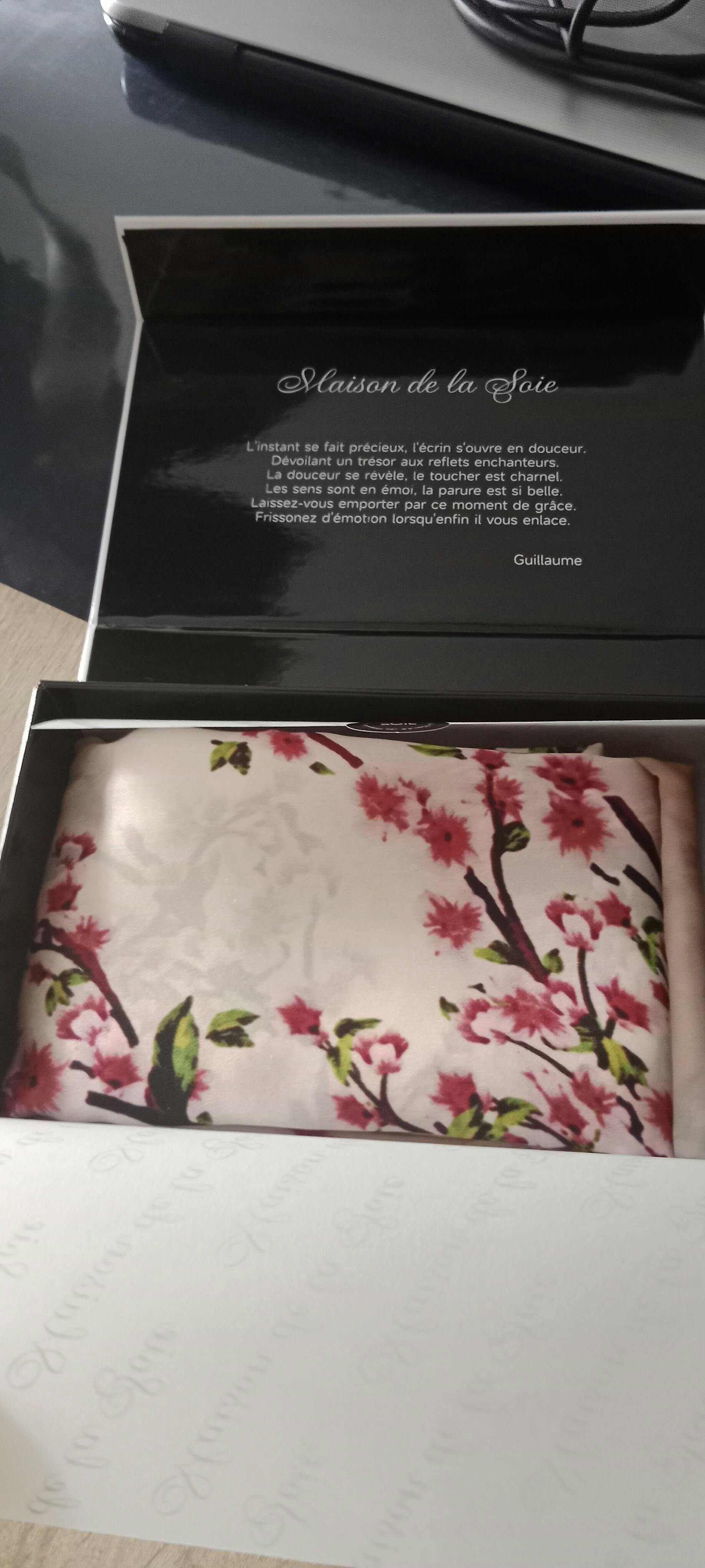 Présenté dans un élégant coffret Maison de la Soie et enveloppé délicatement dans du papier de soie, ce foulard est le cadeau idéal pour toutes les belles occasions.