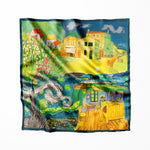 Ce carré de soie Palette lumineuse s’inspire de l’univers pictural de Vincent Van Gogh et de sa manière unique de faire vibrer la couleur. Bleu profond, jaune solaire et vert végétal composent une palette emblématique, révélant des lieux réels baignés de lumière, où la matière picturale devient émotion.