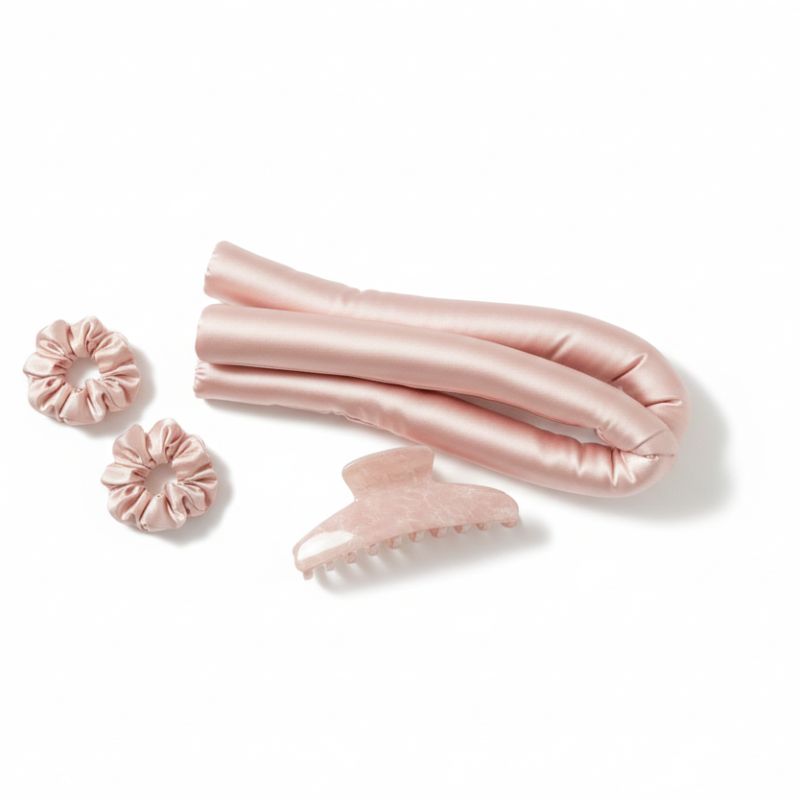 Le kit se compose d’un ruban ou boudin en soie garni de polypropylène, de deux chouchous en soie ainsi que d’une jolie pince effet nacré. Les chouchous et le ruban permettent de maintenir la coiffure durant la nuit, tandis que la pince facilite la mise en place du boudin sur la tête au moment d’enrouler les mèches. Polyvalents, ces accessoires peuvent aussi être portés au quotidien pour attacher ou discipliner les cheveux avec douceur et élégance.
